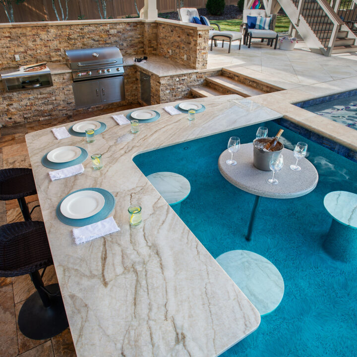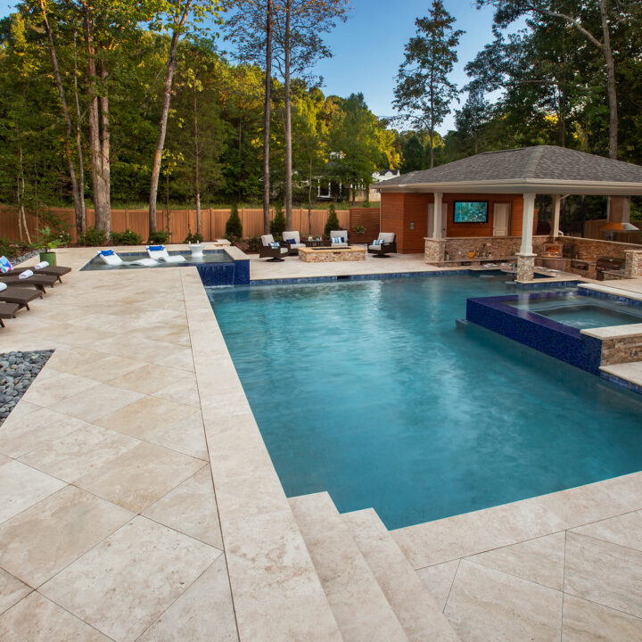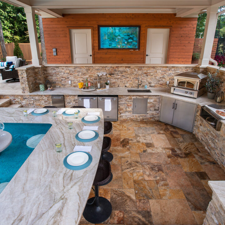 The homeowners first approached us with an idea for a backyard pool, cabana, outdoor kitchen, and firepit. Taking their hand-drawn sketch, our in-house designers created 2D and 3D renderings of what their backyard could look like, and began work after the approval process. As the project progressed, our creative team collaborated with the homeowners on an outdoor bathroom and storage building that would be entertainment-friendly. As we worked this building into the master plan and continued conversations with the homeowner, it became clear that more “dry” space was needed. So we once again tweaked the design plan to add a covered breezeway connecting the cabana to the bathroom along with other walkways that completed the backyard haven.