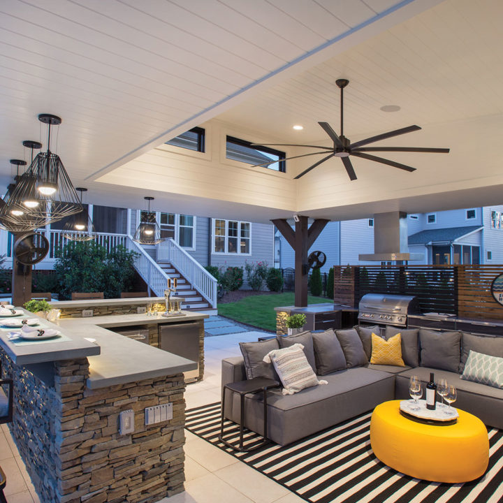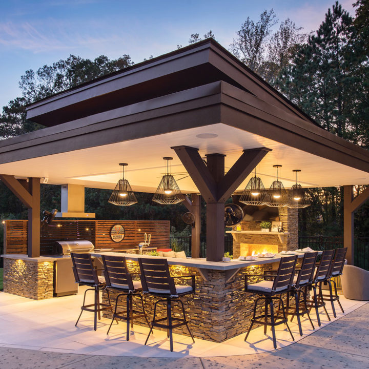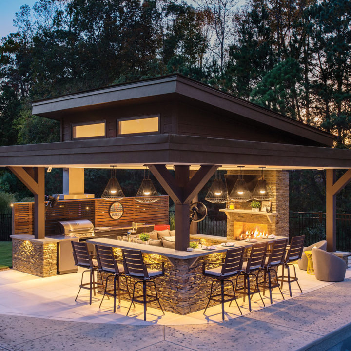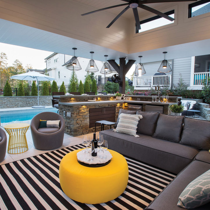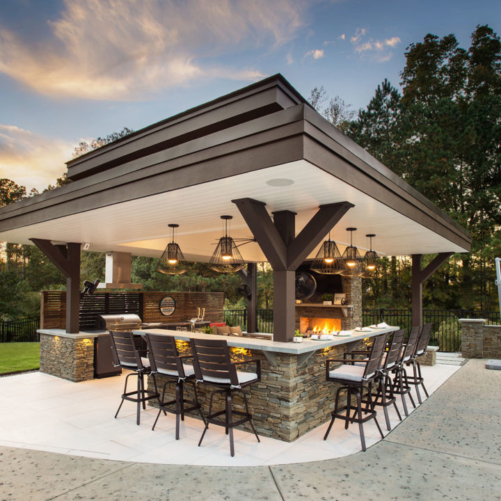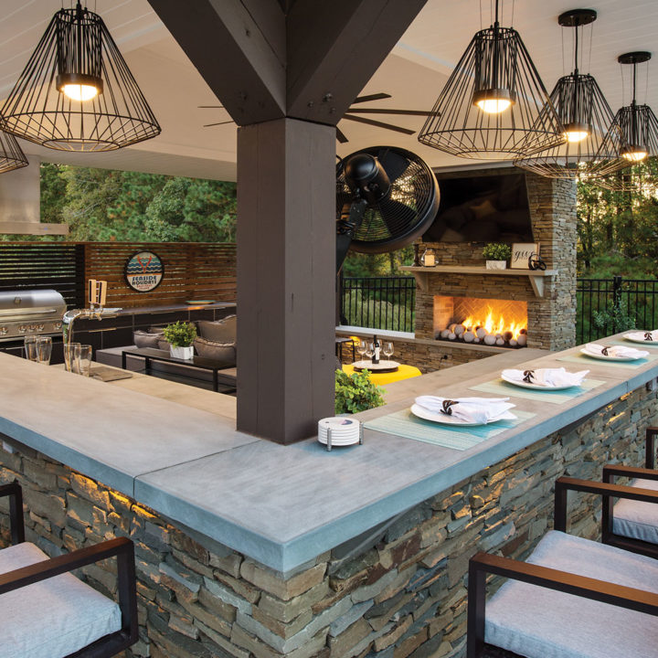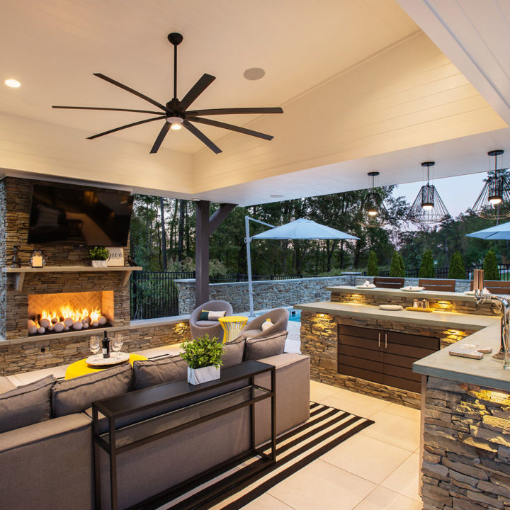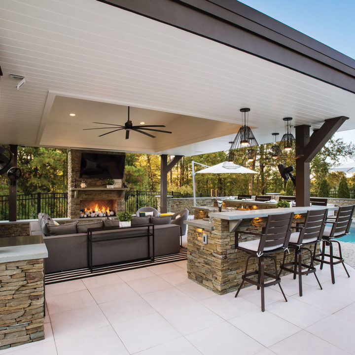 In North Carolina, it can be a challenge incorporating modern structures and elements to a very rustic and traditionally “NC Style.” When ONS arrived, the pool and walls around the pool were already installed, so we had to get creative in how to incorporate a modern cabana. By keeping the bar and fireplace in the same stone but pulling in modern elements such as a modern aluminum grilling cabinet and porcelain tile flooring we achieved a beautiful synchronicity.